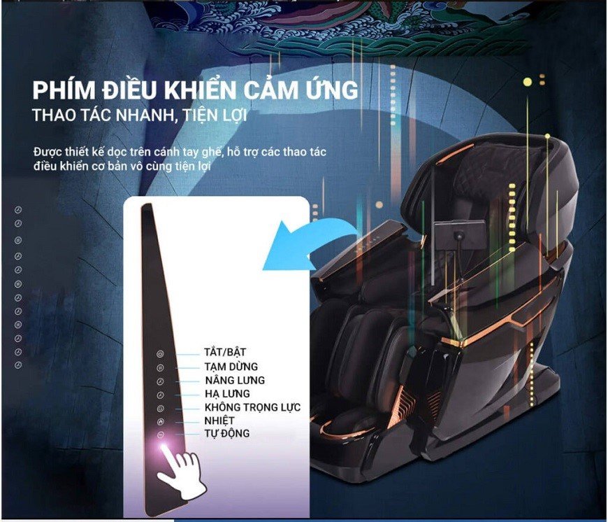 Fuji Care G99 Bên cạnh đó, màn hình điều khiển cảm ứng tiếng việt LCD cùng nút cảm ứng điều khiển nhanh thiết kế dọc thành ghế giúp lựa chọn nhanh các chế độ tùy chỉnh. Chúng ta dễ dàng thao tác như nâng/hạ lưng, tắt/ bật và tùy chọn chế độ massage, nhiệt hồng ngoại và tạm dừng chỉ trong 1 lần chạm giúp các thao tác điều khiển cơ bản vô cùng tiện lợi, nhanh chóng.