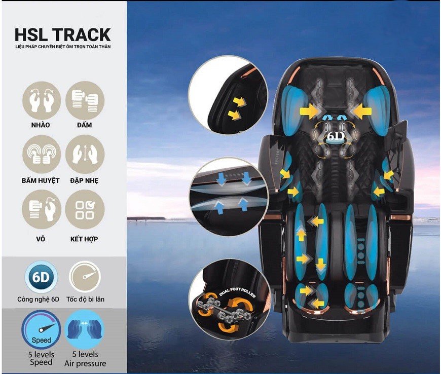 Đường ray HSL – track dài 135cm từ phần cổ vai xuống mông giúp con lăn di chuyển nhịp nhàng và ôm sát theo đường cong cơ thể với liệu pháp chuyên biệt ôm trọn toàn thân. Các con lăn với 5 cấp độ điều chỉnh cường độ massage phân bổ cả phần bắp chân, bàn chân kết hợp với hệ thống túi khí toàn thân xoa bóp liên tục giúp tận hưởng massage thư giãn tối đa, cảm thấy rất dễ chịu và thư giãn gân cốt sau khi massage vì vận động nhiều.
