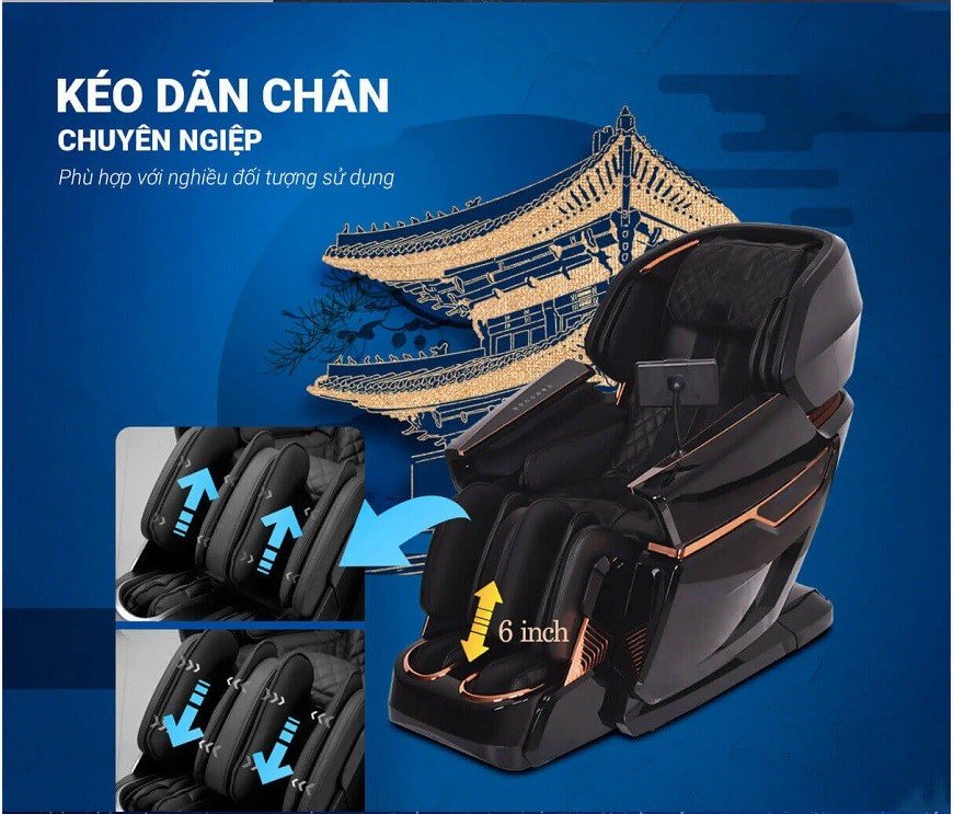 | Chân ghế kéo dài tối đa | 13 cm (Chân ghế tích hợp cảm biến thông minh có thể co ngắn hoặc kéo dài theo độ dài chân người dùng mang đến tư thế massage chuẩn xác thoải mái) |