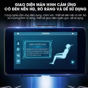 - Màn hình cảm ứng hỗ trợ tiếng Việt: Siêu nét, cảm biến nhạy bén trên từng nút chạm. Với một thao tác, một cử chỉ gạt tay, bạn đã có thể sở hữu toàn bộ những chế độ massage tinh hoa gói gọn trong chiếc ghế massage thông minh này.