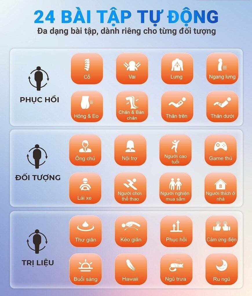 + 24 bài tập massage tự động hỗ trợ trị liệu chuyên sâu, từ cơ bản cho tới nâng cao giúp tối ưu hóa theo nhu cầu và sở thích cá nhân.