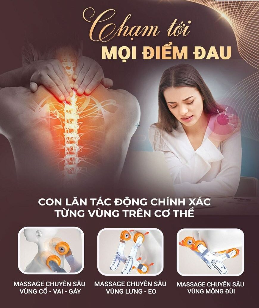 + Hệ thống con lăn Ultra đa chiều, massage hỗ trợ giảm đau mỏi vai gáy, lưng, hông nhanh chóng.