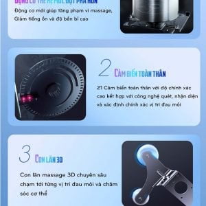 - 8 bài tập chia theo đối tượng: ông chủ, nội trợ, người cao tuổi, game thủ, lái xe, người chơi thể thao, người thích đi mua sắm – di chuyển nhiều, người nội trợ,… Đối với đặc thù công việc và thể trạng cá nhân từng người, sẽ có nhu cầu chăm sóc cơ thể khác nhau. Hệ thống bi lăn và túi khí với thao tác đấm, vỗ, xoa, miết, thực hiện nhanh chậm khác nhau, kết hợp với túi khí co bóp đa cấp độ, tạo nên các bài tập cá nhân hóa, đáp ứng sở thích người dùng